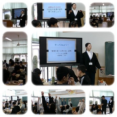今日は6年生のクラスに栄養指導実習の先生が給食のときに「よい姿勢」について分かりやすく教えてくださいました。