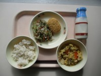 今日の献立は、主食が「麦ごはん」、主菜が「カレー」、副菜が「枝豆サラダ」、果物が「オレンジ」、そして「牛乳」です。