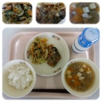 今日の献立は、主食が「ごはん」、主菜が「厚揚げの肉みそかけ」、副菜が「野菜の塩昆布和え」、汁物が「五目汁」、そして「牛乳」です。