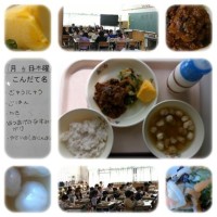 今日の献立は、主食が「ごはん」、主菜が「三河あかどりのチキンカツ」、副菜が「やさいのしらすあえ」汁物が「ごじる」、そして「オレンジ」と「牛乳」です。今日は、大豆の話をします。大豆は、赤色の仲間の食べ物で、体をつくる「たんぱく質」という栄養素がたくさん含まれています。食物の中で1番、肉の栄養バランスに近いことから、「畑の肉」とも呼ばれています。日本には、豆腐、みそ、しょうゆ、納豆など、大豆からできた食べ物がたくさんあります。今日の給食の「呉汁」は、挽き割り大豆やいんげんペーストなど豆類を加工した材料がはいっています今日も残さず食べて元気に過ごしましょう。