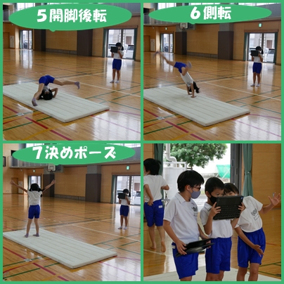 3年生 体育 マット運動 の授業の様子です。chromebookで互いの動きを撮影して次の試技にいかすようにしています。
