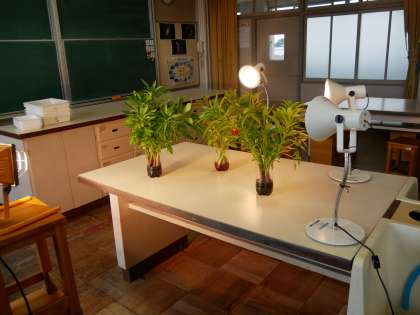6年生 理科の実験 担当教職員が前日からホウセンカに「植物染色液」を吸い上げさせていたのですが、雨天のため、吸い上げが悪く、授業に間に合うように懸命に準備していました。太陽のかわり??
