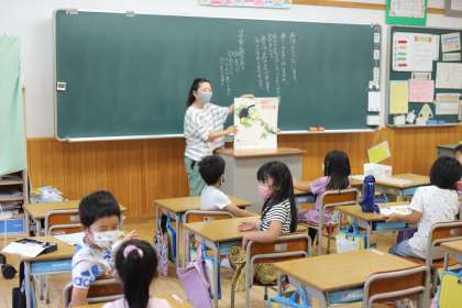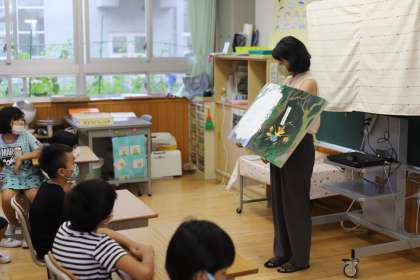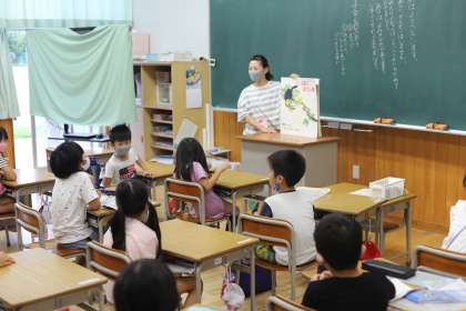 1年生の教室で、クルーズさんが読み聞かせをしてくれました。みんなで集まることはできませんでしたが、大型の絵本を準備してくださったので、見やすかったですね。