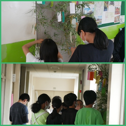 6年生 短冊に願いを書いて結んでいます。願いが叶うといいですね。