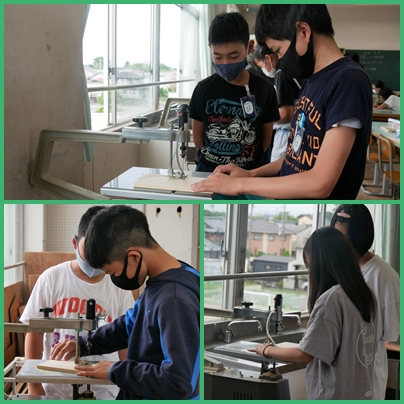 6年生 図工 テープカッターづくり の授業の様子です。電動糸ノコを使って作成しています。事故防止のため、2人で操作しています。