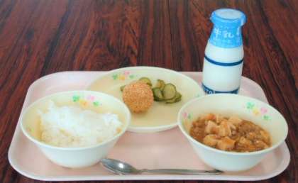 今日の献立は、主食が「ごはん」、主菜が「麻婆豆腐」副菜が「きゅうりの中華和え」デザートが「ごま団子」そして「牛乳」です。中華料理は、中国で食べられてきた料理や調味料を使って作られた料理です。 中国はとても広いため、地域によって料理の特徴が違うので、地域毎に分類されています。 北京料理 は濃いめの味付けで、塩味が強いのが特徴です。代表料理は北京ダックです。 四川料理は香辛料を多く使い、辛い味付けが特徴です。広東料理や上海料理などがあり、中華四大料理と呼ばれています。中華料理は日本を含め世界に広く拡がり、各国の人々の好みにアレンジされてきました。今日も残さず食べて元気に過ごしましょう。
