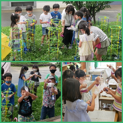 1年生 生活科 あさがおで いろみずあそびをしよう の授業の様子です。色の違うあさがおを混ぜて色を調整して楽しんでいました。