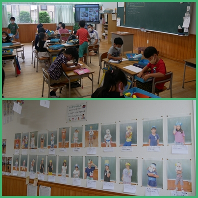 2年生 図工 友だちのさくひんのよいところを見つけよう の授業の様子です。わっかでへんしん の作品のよいところを見つけています。