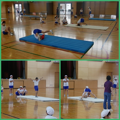 4年生 体育 開脚後転 学習したマット運動にチャレンジしています。