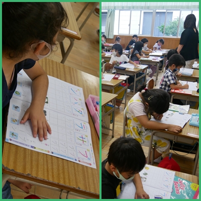 1年生 国語 カタカナ の学習です。「プ」……「プリントのプ!」「プーさんのプ!」「プリンセスのプ!」