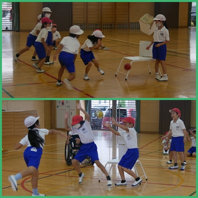 2年生 体育 ボール遊び の授業の様子です。「当てる」「守る」考えて運動しています。