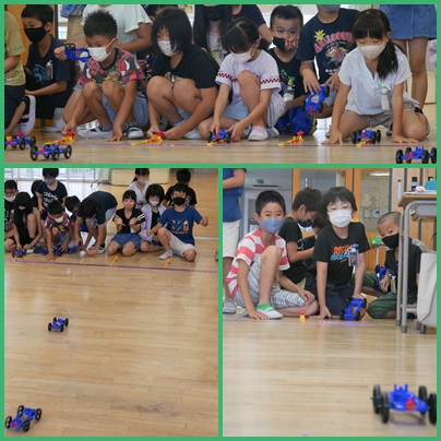 3年生 理科 ゴムを動かす車を、ごーるぴったりに止めてみよう の授業の様子です。遠くに走らせるなら簡単そうですが、「ぴったり」は難しそうです。