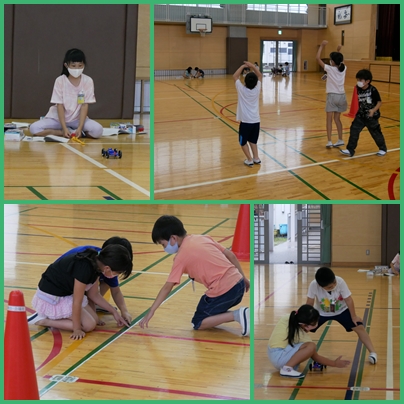 3年生 理科の実験の様子です。ゴムを5センチ・10センチ・15センチにしてみて車がどこまで走るか実験しています。