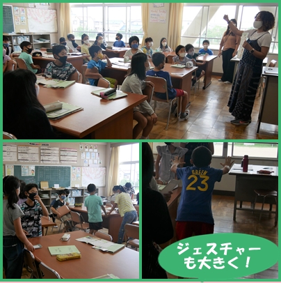 5年生 外国語 What do you want to be? の授業の様子です。ジェスチャーも大きくして相手に伝わるように工夫しています。
