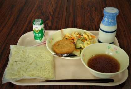 今日の献立は、主食が「中華麺」、主菜が「冷やし中華・枝豆コロッケ」デザートが「乳酸菌飲料」、そして「牛乳」です。枝豆は大豆なので豆と野菜の両方の栄養的特徴を持った栄養価が高い野菜と言えます。 タンパク質、ビタミンB1、カリウム、食物繊維、鉄分などを豊富に含んでいます。枝豆は通常、塩茹でしてそのまま食べるか、塩茹でしてからサヤから豆を取り出して色々な料理に用います。枝豆は茹で方が大きなポイントとなります。 おいしい枝豆の茹で方 は、水…1L 塩は 湯の量に対して4%(塩もみ用も含む) を目安にすると、枝豆をより甘くぷりぷりの状態に仕上げることができます。今日は枝豆を使ったコロッケです。今日も残さず食べて元気に過ごしましょう。