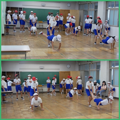 6年生 体育の授業の様子です。雨天で体育館割り当てでないため、今日は筋トレです。