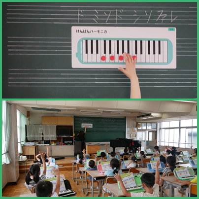 2年生 音楽 ゆびひろげ ゆびせばめ の授業の様子です。鍵盤ハーモニカで「がおがおかいじゅう」の指使いの練習をしています。