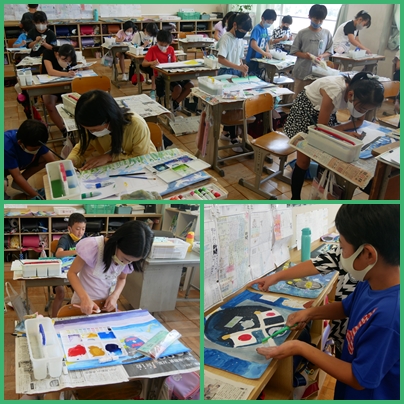 5年生 図工の授業の様子です。歯ブラシを使って星を描いています。