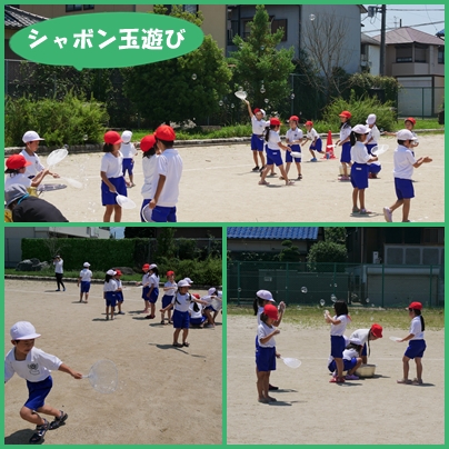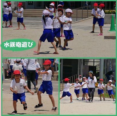 1年生 生活科 水遊び の授業の様子です。 青空の下、運動場では歓声があがっています。