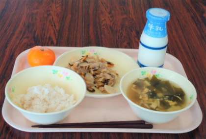 今日の献立は、主食が「むぎごはん」、主菜が「ぶたキムチどんぶり」、汁物が「わかめと卵のスープ」果物がが「冷凍ミカン」、そして「牛乳」です。キムチは、白菜などの野菜と、塩・唐辛子、魚介塩辛、ニンニクなどを使用した韓国の漬物です。キムチは、もともとは朝鮮半島の厳寒期に備えた保存食で、野菜を塩漬けしたものからはじまりました。これに香辛料としてのニンニクやサンショウなどを加えるようになったのが、キムチの原型です。みなさんはキムチは好きですか?韓国では子供が3歳になると少しずつ「キムチ」をたべさせるそうです。キムチが辛いという1年生もいましたが少しずついろいろな味に接してほしいと思います。給食では甘口のキムチを使って作っています。今日も残さず食べて元気に過ごしましょう。