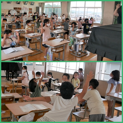2年生 音楽の授業の様子です。音楽を身体で感じて表現しています。このあと鍵盤ハーモニカの指使いの練習をしました。