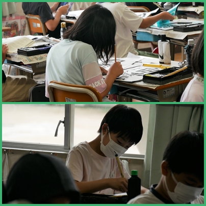 5年生 書写「白雲」授業の様子です。練習が早く終わった子は静かに読書しています。
