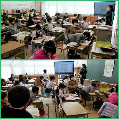 1年生 算数「100までのかずーはっぱのかずをかぞえようー」の授業の様子です。算数のノートに「めあて はっぱのかずをかぞえよう」をかいて、赤枠で囲っています。