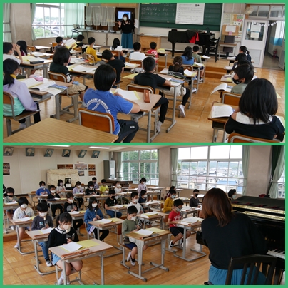 4年生 音楽の授業の様子です。ソプラノリコーダーの指づかいを練習しています。換気をして、人数制限をしながら、リコーダーや合唱練習を少しずつ行っています。