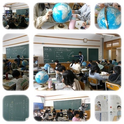 社会の授業では、地球儀を使って「北極」や「南極」の位置を確認していました。