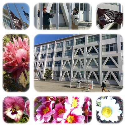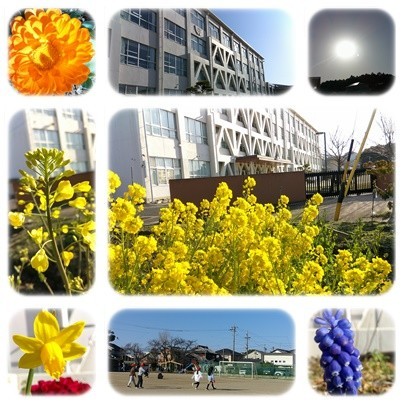 菜の花が校門でお出迎えをしています。校庭の花もたくさん咲いてきました。