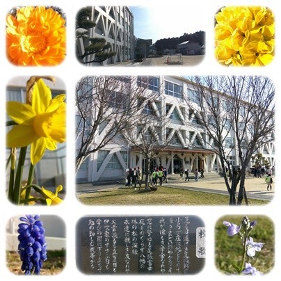 菜の花が校門でお出迎えをしています。校庭の花もたくさん咲いてきました。