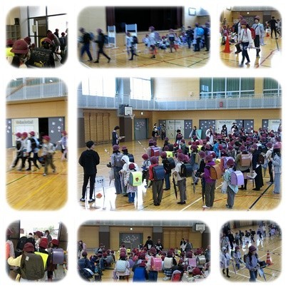 雨降り下校の様子です。体育館に通学班ごとに並んで下校します。