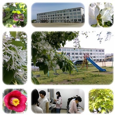 雨がやんで、太陽が顔を出しました。校庭のアオモミジやヒトツバタゴが風に揺れています。