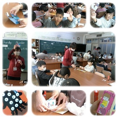 お昼放課にブックイベントがありました。ポスターを再利用してカードケースを作りました。