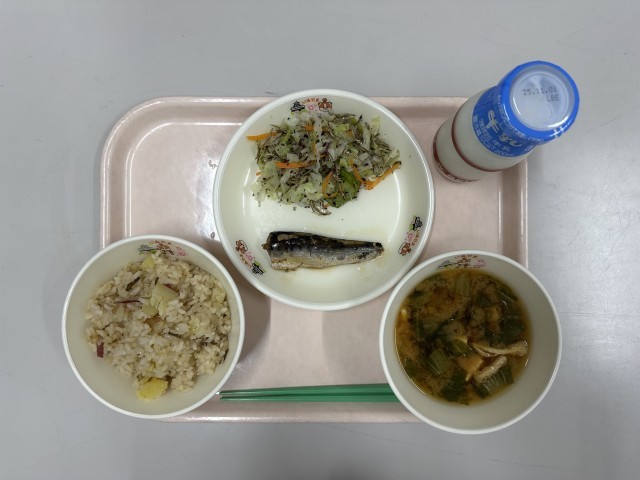 ・さつまいもご飯  ・牛乳  ・いわしの生姜煮  ・キャベツとしらすのゆかり和え  ・チンゲン菜入りみそ汁