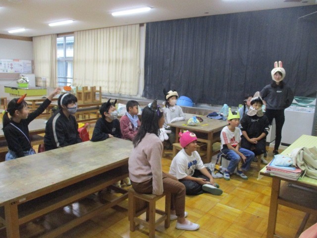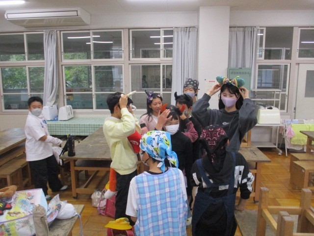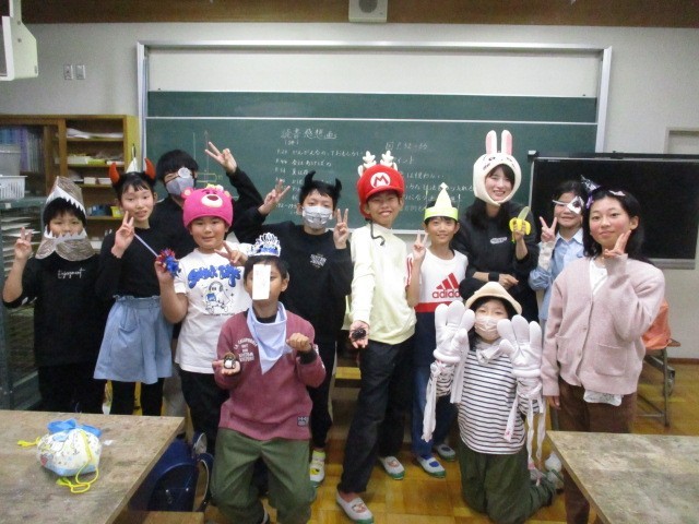 今日の6時間目はお楽しみ会をしました。家から持ってきたものや作ったもので仮装をし、ゲームやお話をしてとても盛り上がりました。最後はみんなで記念撮影!