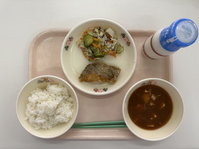 ・ごはん ・牛乳 ・ホキの揚げ煮 ・ゆかり和え ・鶏ごぼうみそ汁