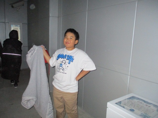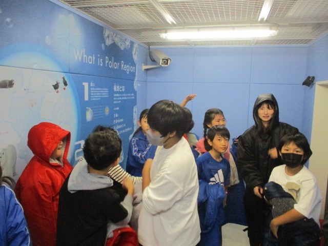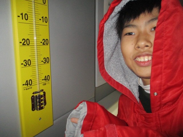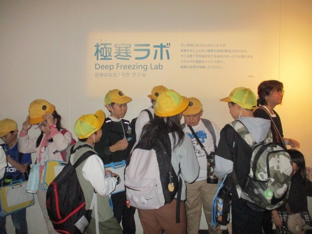 人気でなかなか入室困難な「極寒ラボ」にみんなで入ることができました。-30度の世界を5分間体験します。南極の氷をさわったり、気温計を見たり、髪の毛が凍ってしまった子もいましたよ!