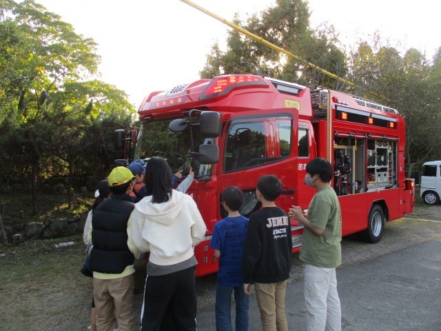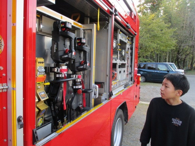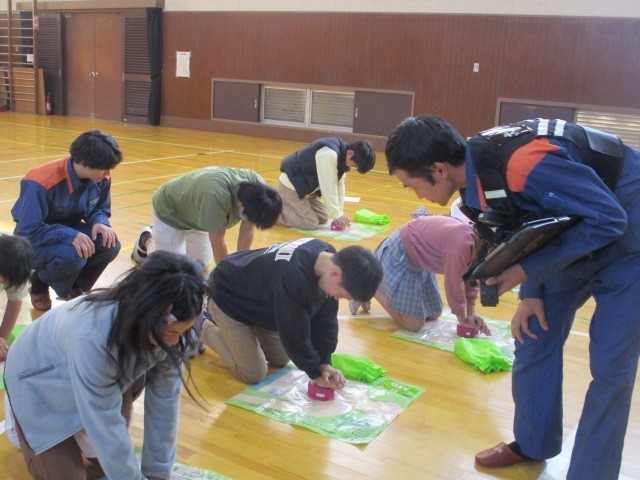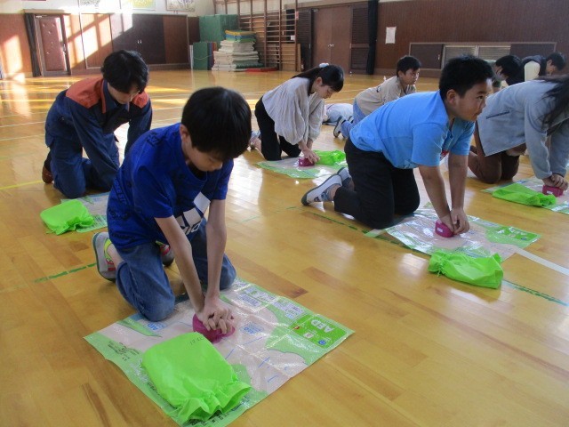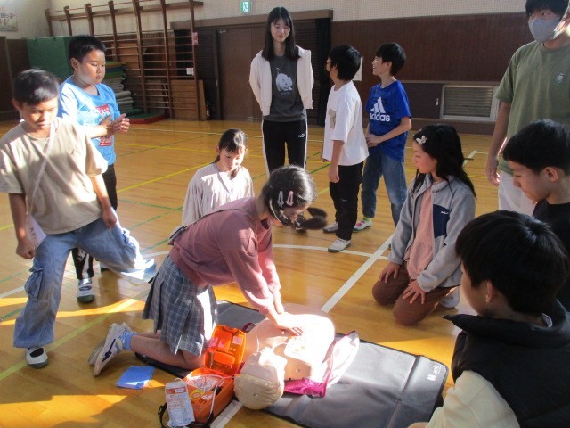 今日の6時間目に、ジュニア救命士育成の講習会がありました。犬山市消防署より、お二人の消防士さんを講師にお迎えしました。実際に心肺蘇生法トレーニングキットを使って、救命救急の練習をしました。最後は、消防車の見学もさせていただきました。