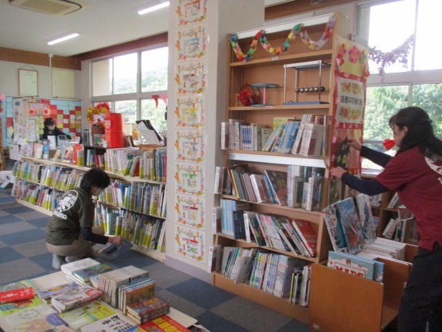 高学年の委員さんたちがお手本になって活動し、いつも年下の子たちに優しく接してくれています。館内で他学年どうしが交流ができ、1年生の子たちにとって、高学年のお兄さんお姉さんと会えるうれしいひとときです。
