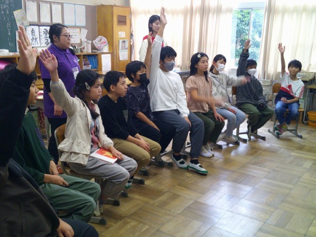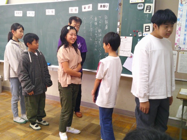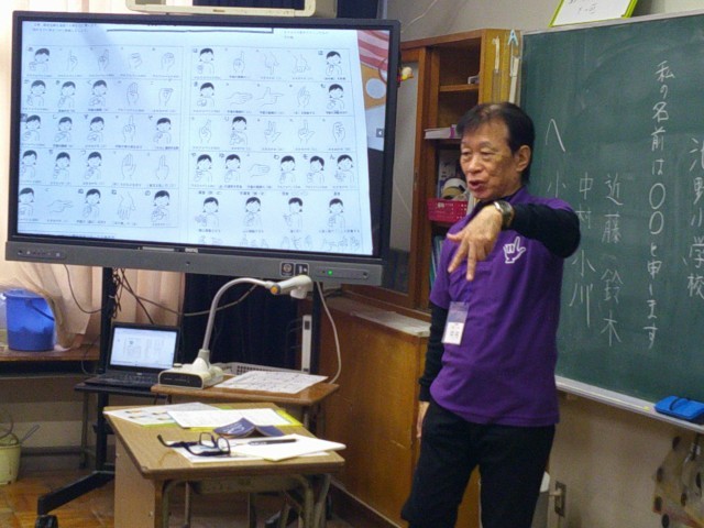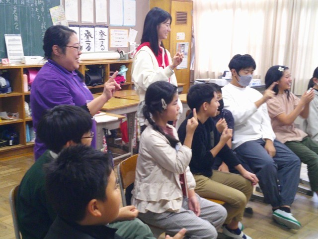 今回は「手話」について学びました。耳の聞こえない方に伝えるためには、6つの方法があります。「身振り」「筆談」「空書」「口話」「手話」「指文字」です。それぞれについて実際にやってみたり、ゲームで試したりして覚えました。あいさつや自分の名前の紹介が、手話でできるようになりました。