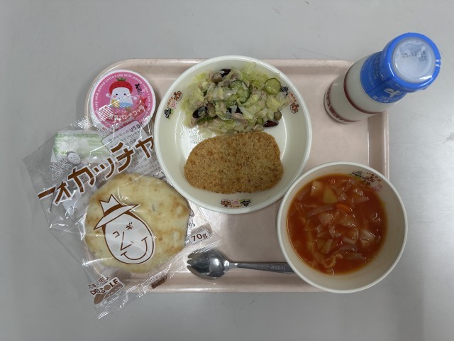 ・フォカッチャ ・牛乳 ・カツレツ ・インサラトーナ ・ミネストローネ