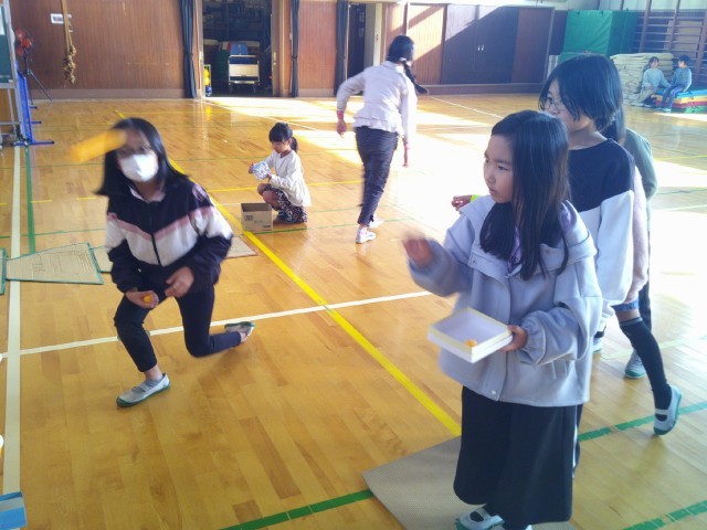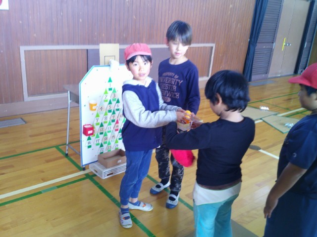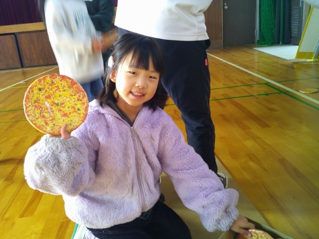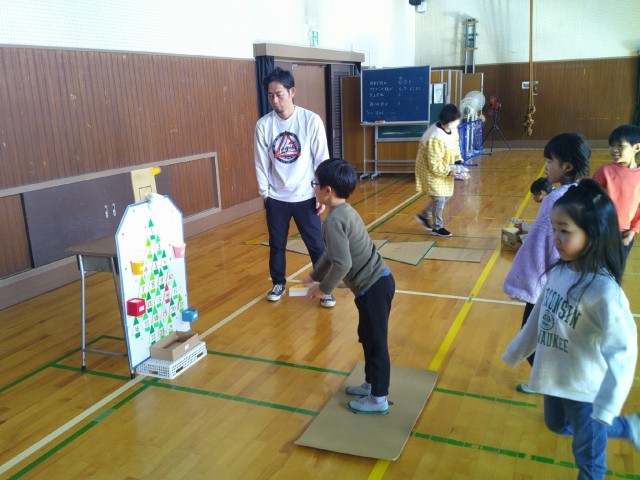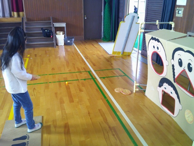 今日は楽しみにしていた移動児童館の日です。ピザをフリスビーのようにして、お口に入れるゲーム、クリスマスツリーのオーナメント型のカップにピンポン球を入れるゲーム、卵ケースをカーリングのように滑らせて止まった所の点数を競うゲームをみんなで楽しんでできました。