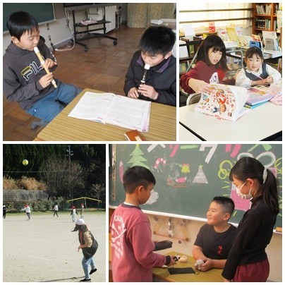 池野っ子たちは、学年の垣根を越えて一緒に遊ぶ姿がよく見られます。なわとびの練習をしたり、リコーダーを奏でたり、一緒に本を読んだりと、それぞれが思い思いに楽しい時間を過ごしていました。