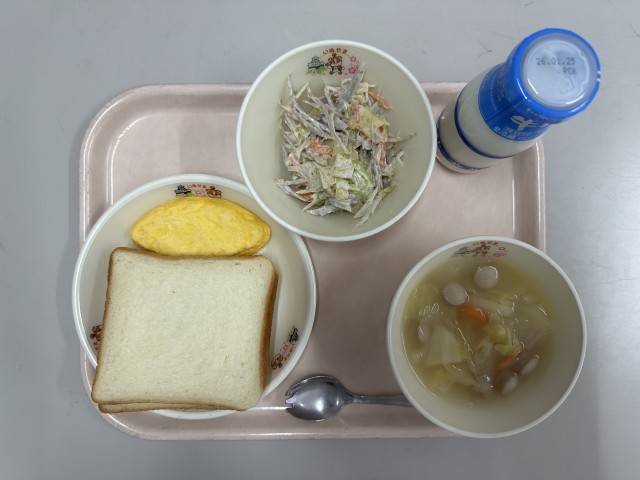 ・スライスパン ・牛乳 ・オムレツ ・ごぼうサラダ ・ポトフ