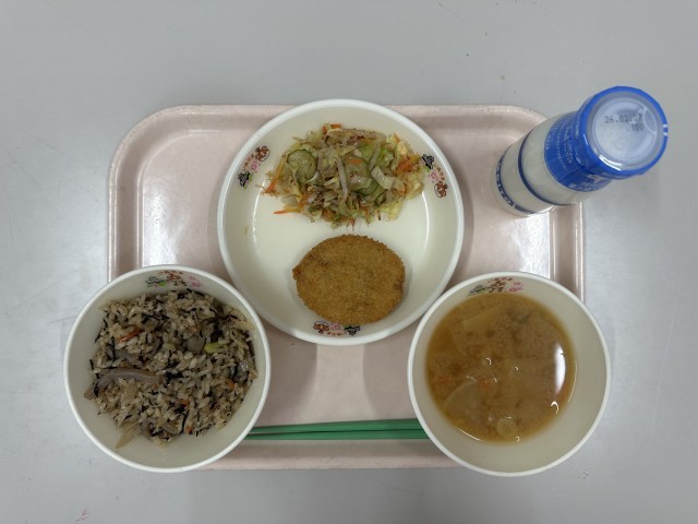 ・五色ごはん ・牛乳 ・昔ながらのコロッケ ・キャベツのおかか和え ・栄養みそ汁