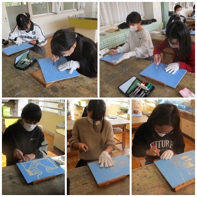 6年生は、図工の時間に版画制作を行っています。各自がテーマを決め、思いを版に込めながら、集中して作業を進めていました。