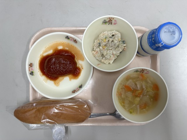 ・ロールパン ・牛乳 ・煮込みハンバーグ ・れんこんのごまマヨ和え ・冬野菜のあったかスープ