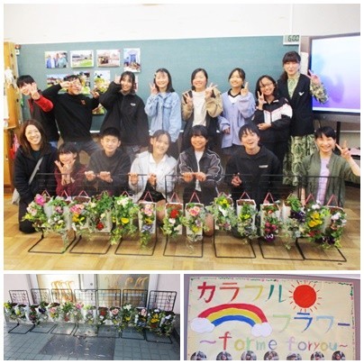 ハンギングバスケットの制作では、パンジーやビオラなどの花苗を思い思いに組み合わせてアレンジし、すてきな作品が出来上がりました。卒業まで水やりや花がら摘みをして、大切に育てていきます。