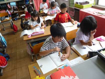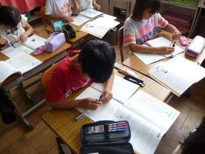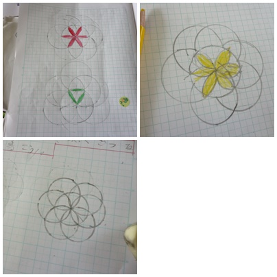 今日は、コンパスを使って、円を重ねて、もよう作りです。